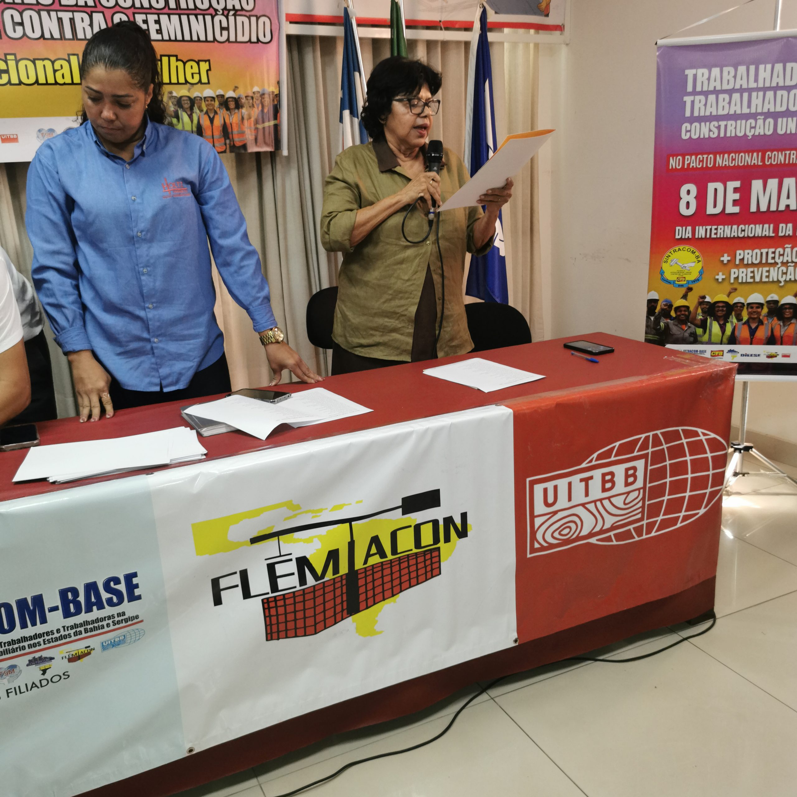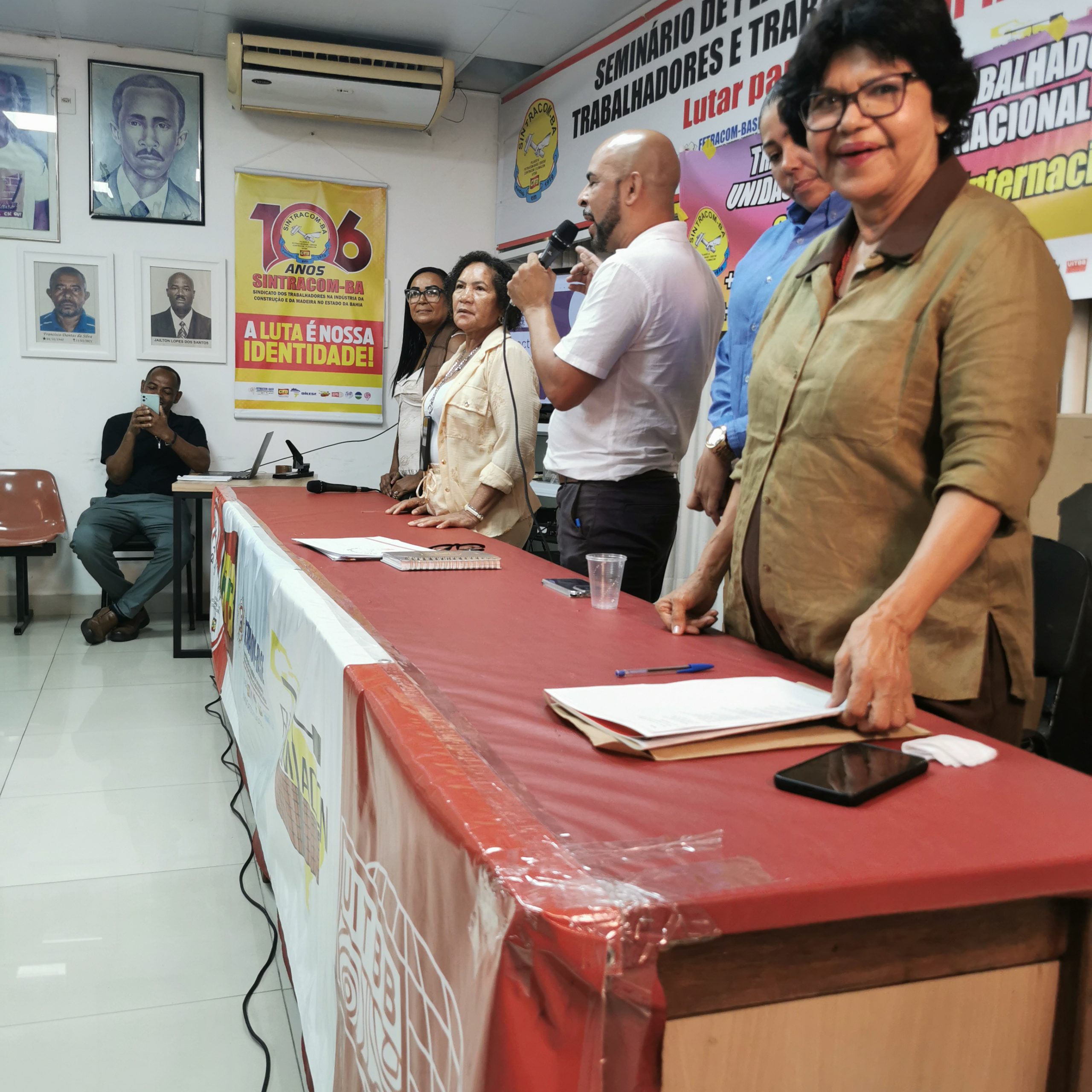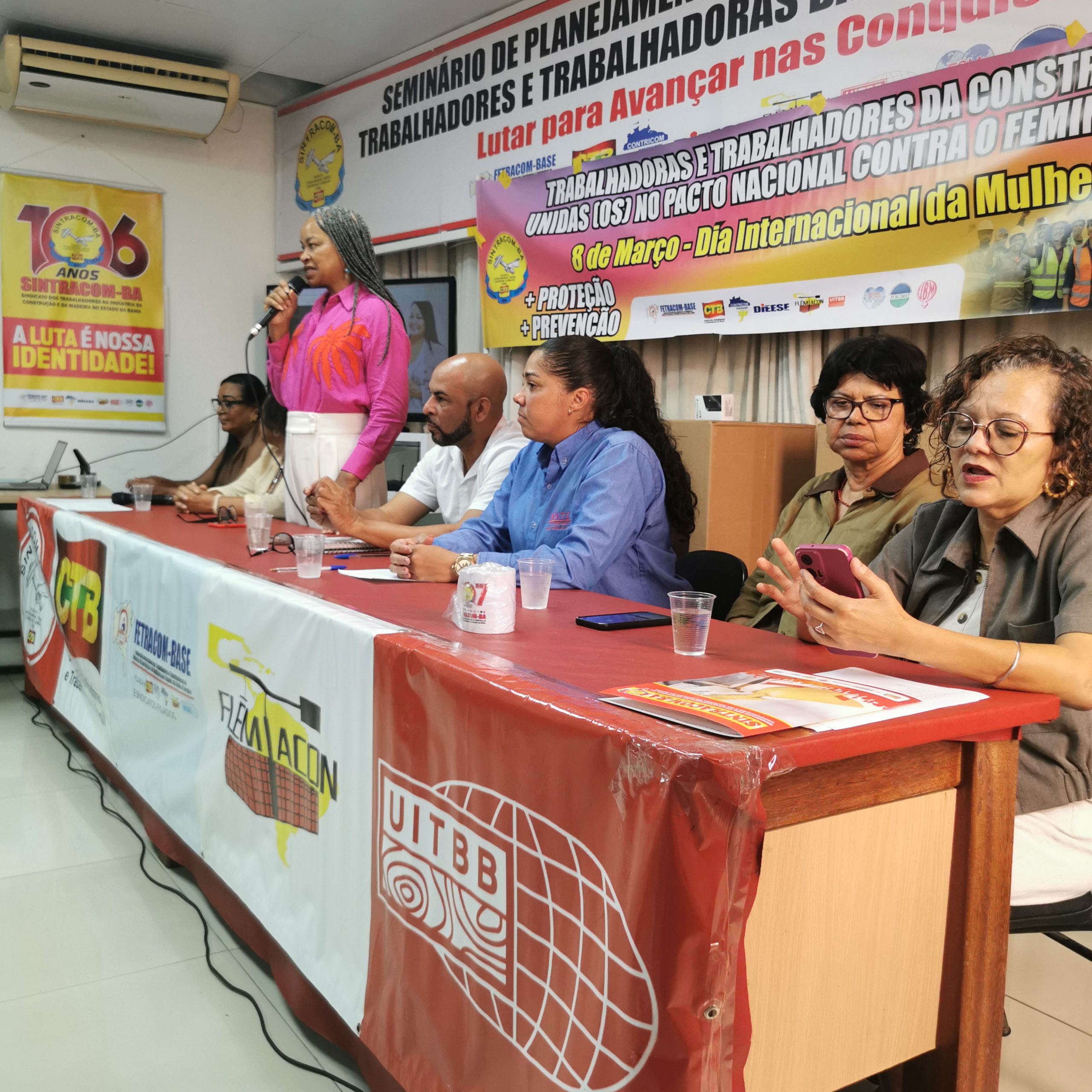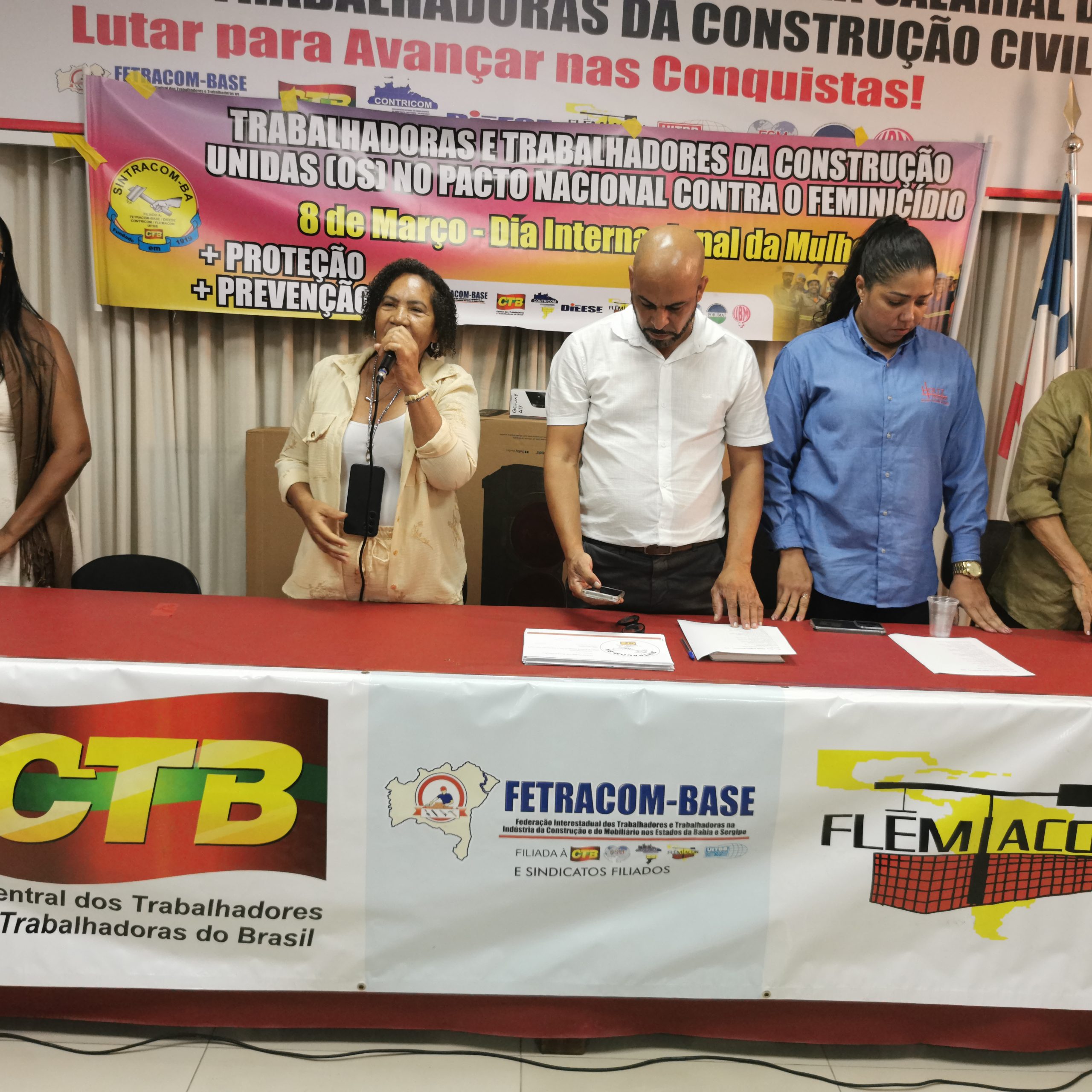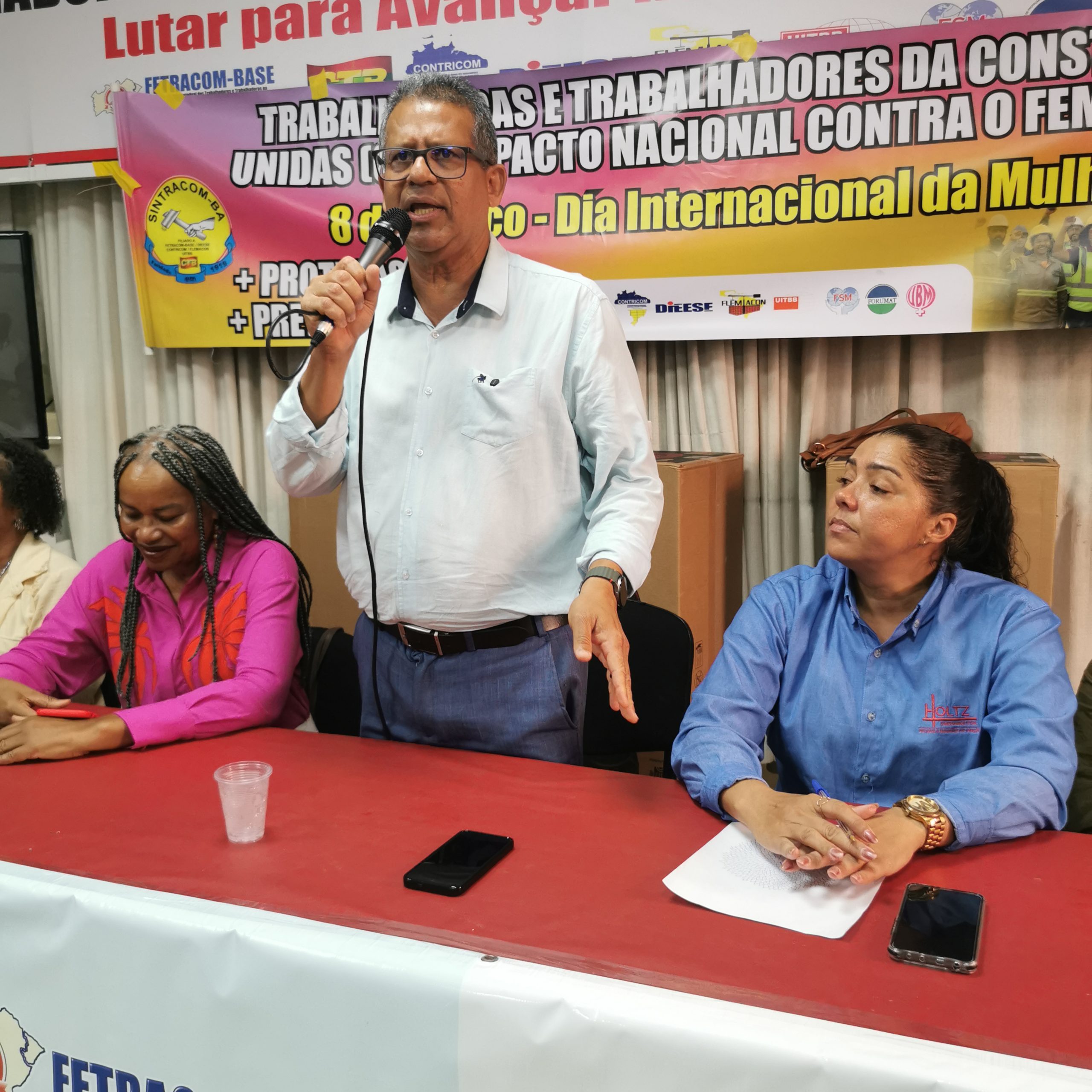 O Secretário Estadual de Trabalho, Emprego, Renda e Esportes (Setre), Augusto Vasconcelos fez uma saudação às trabalhadoras da construção civil pelo mês que celebra sua luta por direitos e ao SINTRACOM-BA pela realização de um evento abordando o Feminicídio – um tema tão importante para a sobrevivência das mulheres. Falou sobre o compromisso de promover uma maior presença de mulheres no mercado de trabalho, dos cursos de capacitação profissional que vem realizando na Setre, voltados para que mulheres possam se tornar profissionais da construção civil, que é importante para a economia. E ressaltou que as mulheres devem estar em todos os espaços.